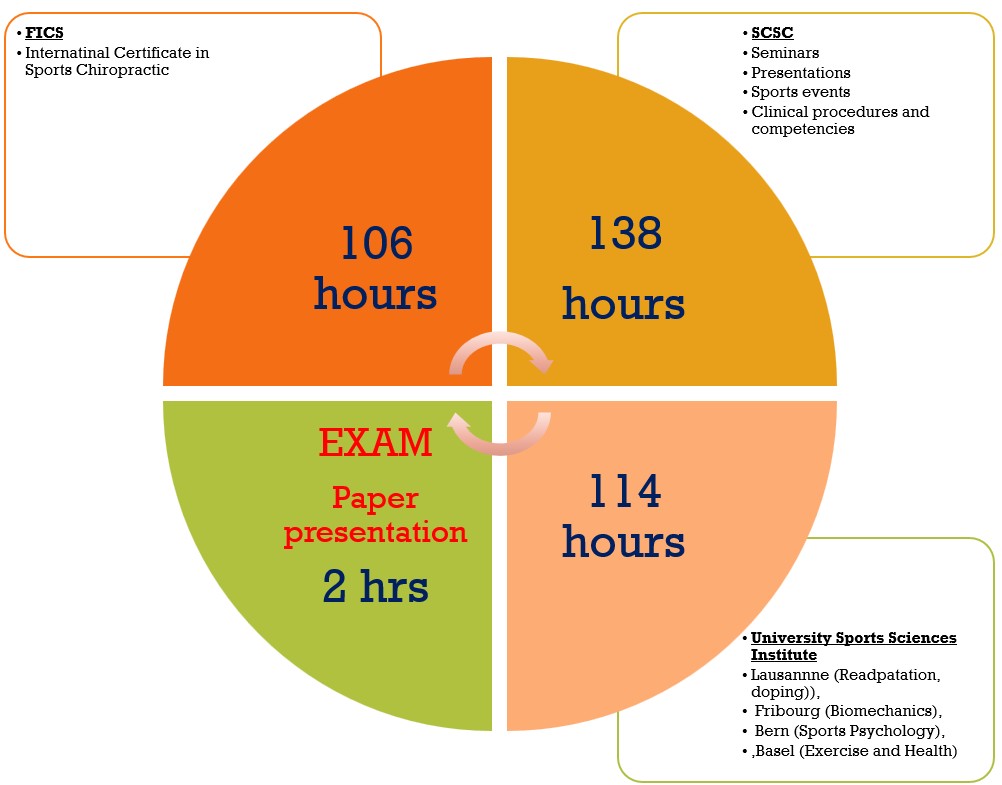 The Module 2 of this complementary sports education will need an extra 200h of sports education to fulfill the 300h formation required by the Swiss Chiropractic Academy for the obtention of a ChiroSuisse Complementary Certification. A suggested possibility to cumulate 200h after the 100h already obtained from the ICSC program, would be 100h practical experience (out-of-clinic sport experience, maybe also case study and/or peer group presentations) and another 100h through 6-8 additional seminars and/or courses in collaboration with the Swiss Association of Sports Medicine.